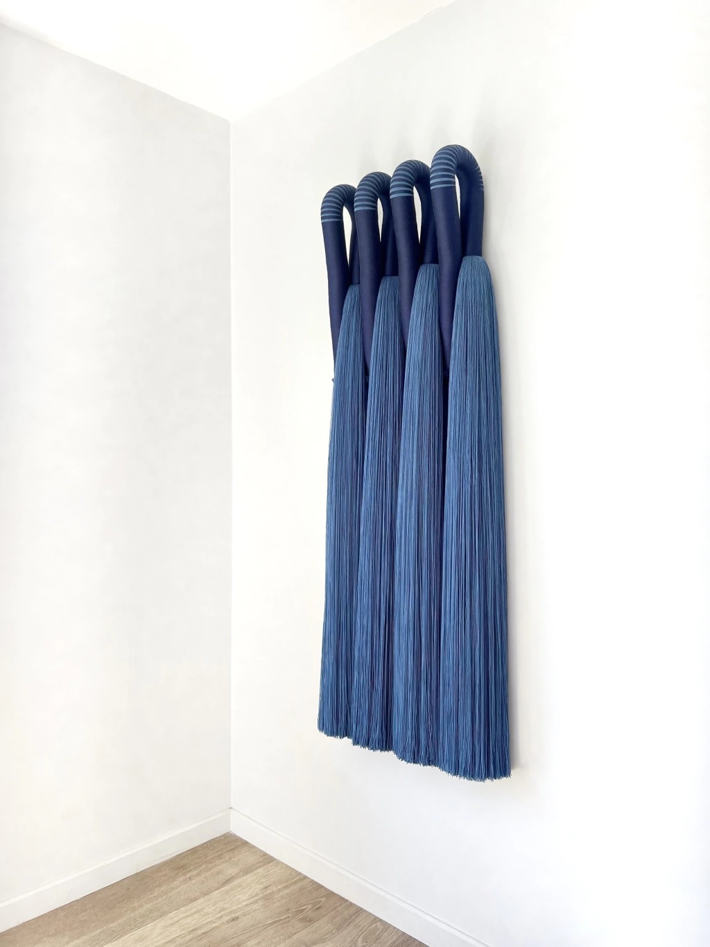 En sus piezas usa diversos materiales: hilos de acrílico ultra delgados, hilos de algodón de diferentes hebras —teñidos con hierbas— y lana de ovejas “amasada” por ella misma. Con estas obras logra curvas y texturas, generando diferentes relieves que luego transforma en cuadros, esculturas o instalaciones. “He descubierto las múltiples capacidades del hilo, entre otros, generar estructuras rígidas”, cuenta.