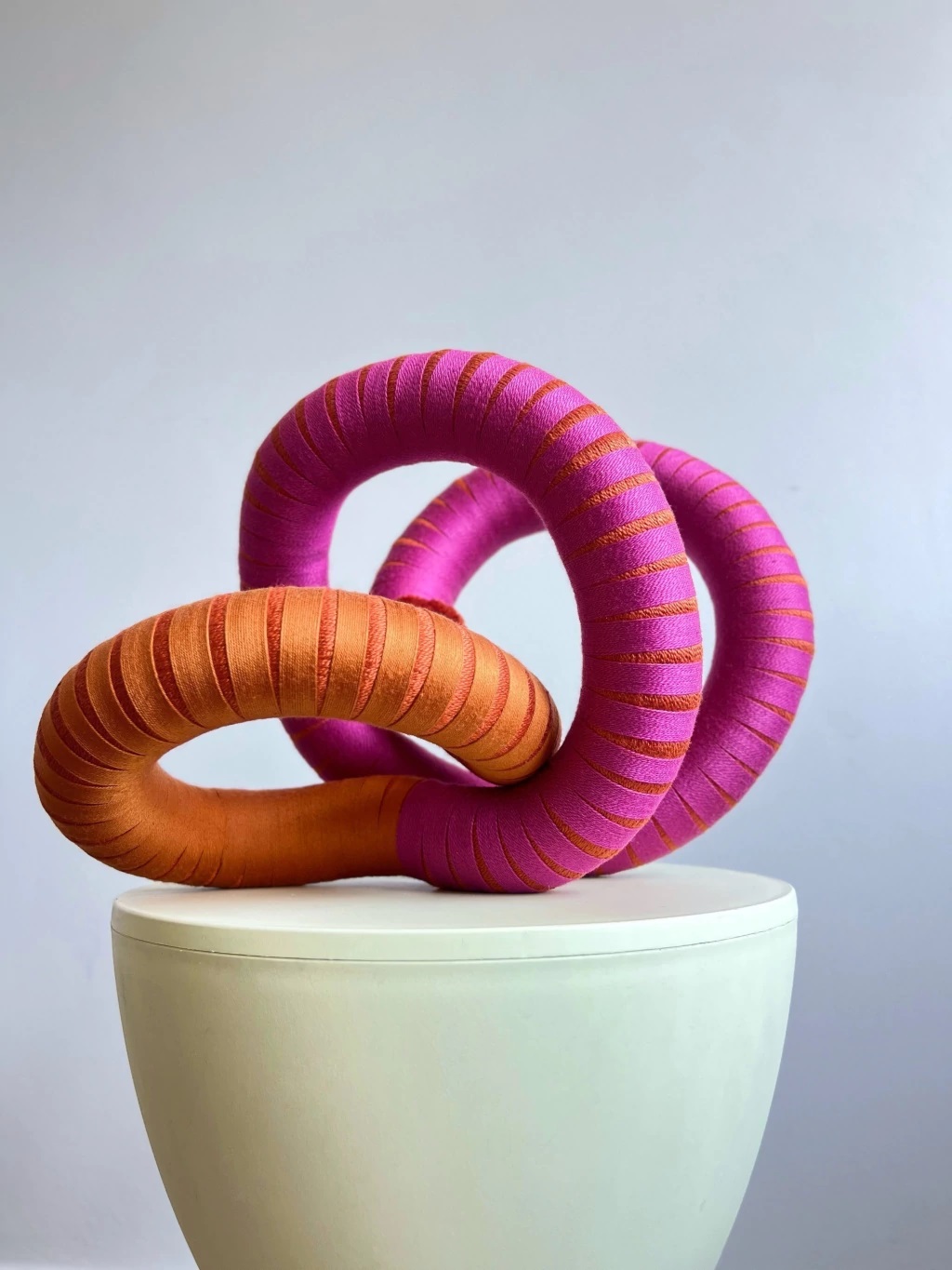 Arquitecta y diseñadora industrial, dejó de lado la fabricación de muebles y objetos utilitarios por la “arquitectura blanda”. Y es que recién aterrizada en su taller en Las Condes le tocó el estallido social y luego, la pandemia. Antes de la cuarentena compró 20 kilos de hilos. “Hacía y desarmaba para hacer más, fue un tiempo para avanzar, estudiar técnicas, mezclar técnicas precolombinas, argentinas, tradiciones. Todo lo aprendido lo fui plasmando en esculturas textiles”, recuerda.